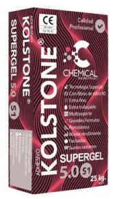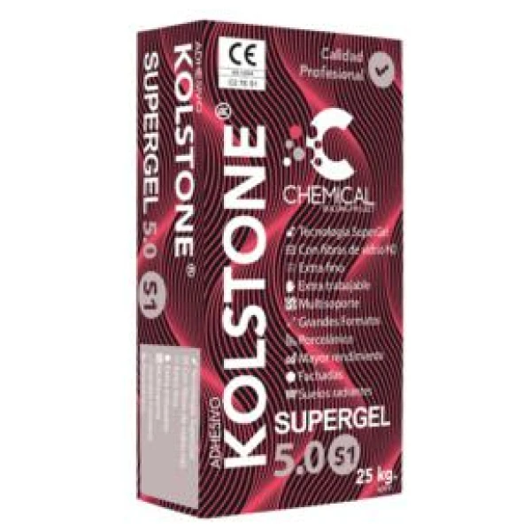 Kolstone SuperGel 5.0 S1 es un adhesivo gel extrafino y extra trabajable armado con fibras de vidrio HD, C2 TE S1 según la UNE-EN 12004 de elevada blancura, flexibilidad, deslizamiento nulo, finura y tiempo abierto ampliado para el encolado de todo tipo de piezas cerámicas y porcelánicos, mármol, granito, etc. En pavimentos y revestimientos interiores y exteriores. Apto para fachadas, superposiciones y rectificados, para pavimentos de calefacción radiante y cámaras frigoríficas. Gracias a su tecnología supergel, el adhesivo trabaja con una cremosidad y una textura que le proporcionan una puesta en obra óptima tanto en consistencia tixotrópica como fluida.